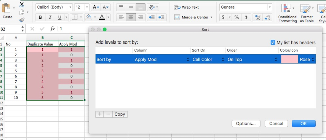 When you click ‘ok’ the rose colored cells in the ‘apply mod’ will be on top. You have now separated the duplicates.