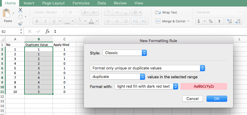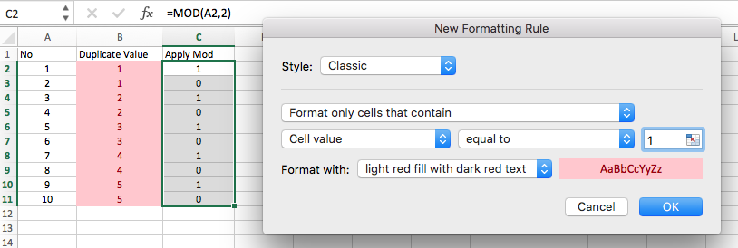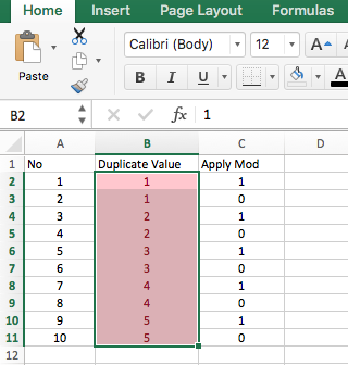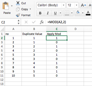 Then in the “Apply Mod” as in fig 4 use the forumla =mod(A2,2) where “A2” is the column/row name and “2” is the number of duplicate values. In this case for each value there is a duplicate and if for each value there is a triplicate then use “3” instead of “2”. Then populate the entire column with the calc by dragging it down or double clicking it in the corner of the cell.